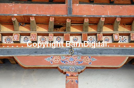 Carved and painted timbers in the colonnade surrounding the courtyard of Wangdue Phrodrang Dzong. Wangdue Phrodrang Dzong. Buhtan, Druk Yul. 14 November 2006