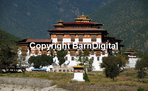 The vast whitewashed stone walls and ornate roof of Punakha Dzong. Punaka, Punakha, Druk Yul, Bhutan. 14 November 2007.