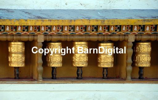 A row of prayer wheels at the Khuruthang Goemba, Buddhist monastery at Khuruthang. Khuruthang, Punaka, Bhutan Druk Yul.14 November 2007