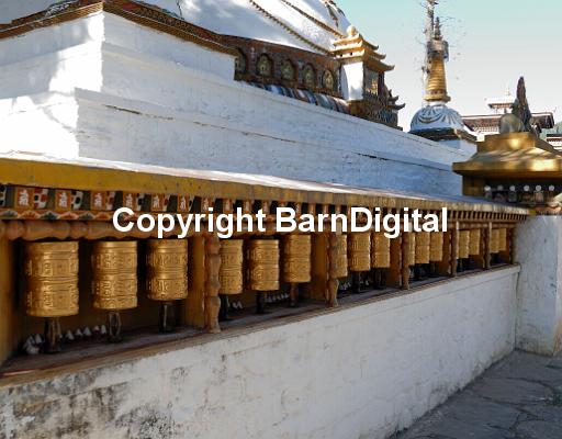 A row of prayer wheels at the Khuruthang Goemba, Buddhist monastery at Khuruthang. Khuruthang, Punaka, Bhutan Druk Yul.14 November 2007