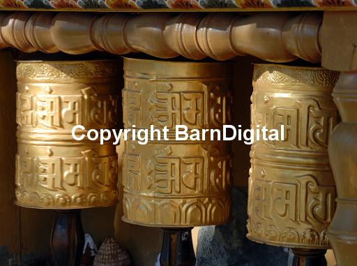 A row of prayer wheels at the Khuruthang Goemba, Buddhist monastery at Khuruthang. Khuruthang, Punaka, Bhutan Druk Yul.14 November 2007