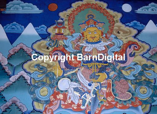 Mural painting Bhutanese mythological historic Bhuddist symbolis