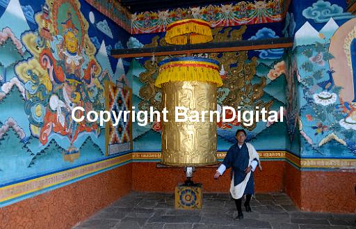 A young Bhutanese man in traditional dress of a gho with a kabney over his shoulder stands by a giant prayer wheel. The walls behind him are decorated with religious paintings. Punaka Dzong, Druk Yul, Bhutan. 14 November 2007.