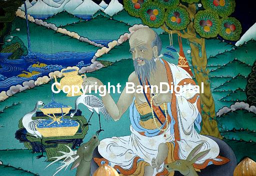 A painting in traditional Bhutanese style shows a benevolent contemplative sage giving food and drink to a pair of cranes while a pair of deer look on adoringly. The picture is full of allegorical meaning and auspicious Buddhist symbolism relating to a long life, the six symbols of longevity. It originates in Chinese and Tibetan buddhist art. Punakha Punaka Dzong, Druk Yul, Bhutan. 14 November 2007