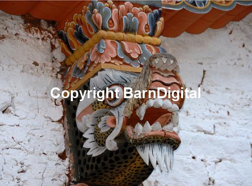 An intricately painted dragon's head supports timbers in Punakha Dzong. Punaka, Punakha, Druk Yul, Bhutan. 14 November 2007.