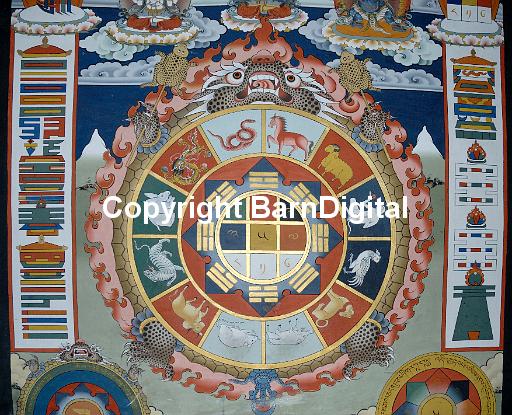 A traditional Tibetan calendar and astrological diagram painted on the wall in Punaka Dzong. The diagram depicted as being is painted on the undershell of a golden tortoise whose head, tail and limbs can be seen. The months are represented by: Hare, Dragon, Snake, Horse, Sheep, Ape, Bird, Dog, Pig, Mouse, Bull, Tiger. The earth spirit is symbolised by the impaled frogs. Punaka Dzong, Punaka, Bhutan, Druk Yul. 14 November 2007