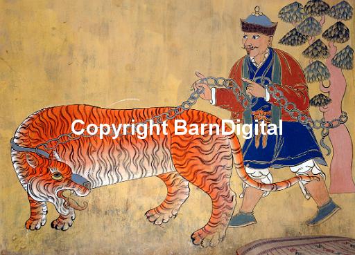 Mural painting of a Mongol with a chained tiger symbolising the supremacy of the Mongolian yellow hat buddhists over the Tibetan red hat buddhists in Bhutan. Trongsa Dzong, Druk Yul, Bhutan. 15 November 2007