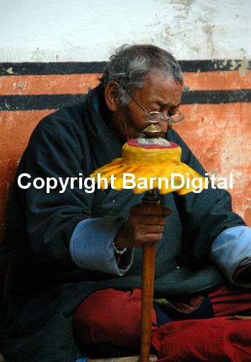An old man sits against the wall of a shrine and spins a prayer wheel with a bright yellow fringe. Bumthang, Bhutan, Druk Yul. 16 November 2007