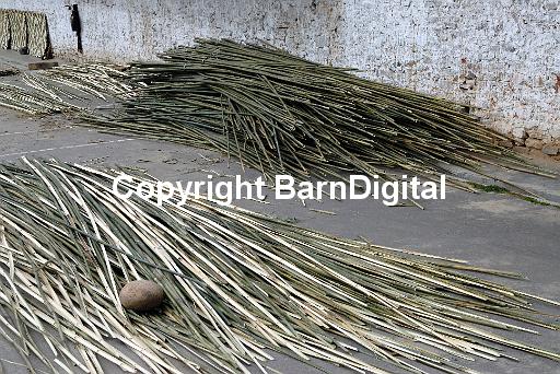 Bamboo stems and split strips ready for weaving into mats. The dark green outside of the stem is alternated with the white inside to produce a pattern. The matting is very strong and is used as a building material, particularly at the gable ends of houses. Used like this it allows air flow through the roof space where agricultural produce is stored. Bumthang, Bhutan, Drul Yul. 16 November 2007
