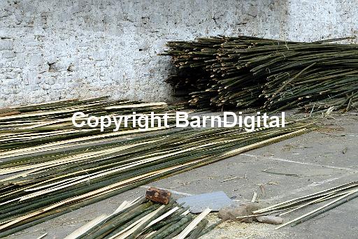 Bamboo stems and split strips ready for weaving into mats. The dark green outside of the stem is alternated with the white inside to produce a pattern. The matting is very strong and is used as a building material, particularly at the gable ends of houses. Used like this it allows air flow through the roof space where agricultural produce is stored. Bumthang, Bhutan, Drul Yul. 16 November 2007
