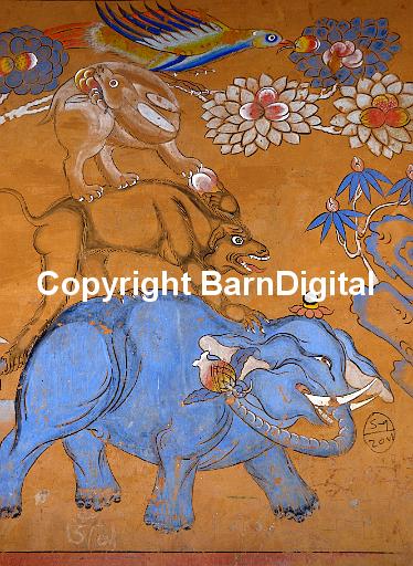 Painting illustrating the ancient Tibetan Buddhist tale of the Four Friends or Harmonious Brothers on a wall. The four friends are an elephant, a monkey, a hare (sometimes a rabbit) and a partridge (sometimes a peacock or grouse). The fable relates both to the status due to age and cooperation. The four friends establish their ages and hence rank by recounting their earliest recollections of a banyan tree. By cooperating the four firends can reach fruit high in a fruit tree. Wangdichholing Dzong, Bhutan, Druk Yul. 16 November 2007