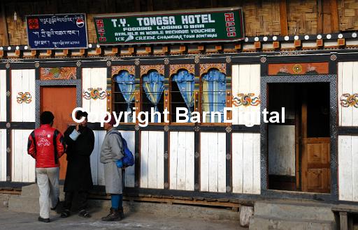 Young men talking outside the T.Y. Tongsa Hotel in Bumthang. Two are in traditional dress, the gho, and one is not. The Hotel is built from wood with bamboo matting and is decorated in traditional style with Buddhist symbols. Above the open door is the wheel and deer emblem representing the Buddha's first discourse in the deer park.Above the closed door is the mythical Garuda. The door frames are decorated with swastikas which also appear on the hotel sign, both left and right handed. Between the doors and windows are wheels of joy and there are jewels on the window frames. Chamkhar, Bumthang, Bhutan. Druk Yul. 16 November 2007.