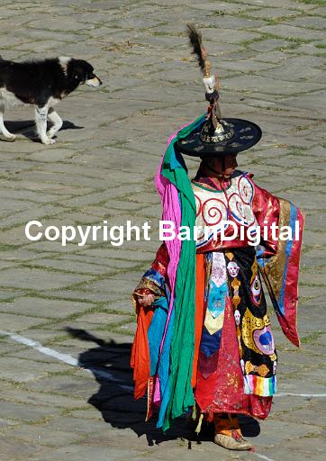 A black hat dancer dressed in gorgeous silk robes dances across the courtyard of Mongar Dzong during the Mongar festival, Mongar Tsechu. A dog wandering across the courtyard is not impressed. Mongar, Bhutan, Druk Yul. 18 November 2007