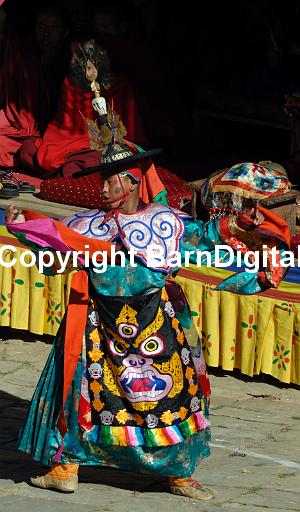 A black hat dancer dressed in gorgeous silk robes spins across the courtyard of Mongar Dzong during the Mongar festival, Mongar Tsechu. Mongar, Bhutan, Druk Yul. 18 November 2007