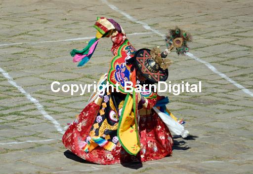 A black hat dancer dressed in gorgeous silk robes spins across the courtyard of Mongar Dzong during the Mongar festival, Mongar Tsechu. Mongar, Bhutan, Druk Yul. 18 November 2007