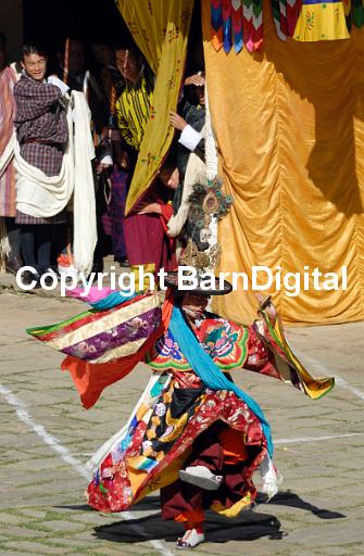 A black hat dancer dressed in gorgeous silk robes spins across the courtyard of Mongar Dzong during the Mongar festival, Mongar Tsechu. Mongar, Bhutan, Druk Yul. 18 November 2007