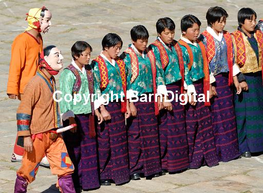 A bawdy masked clown, atsara, torments a choir of elegant young ladies at the Mongar festival, Mongar Tsechu. The ladies are dressed in traditional style in Kira (skirt) wonju (blouse) and toego (jacket) . Mongar Dzong. Mongar, Bhutan, Druk Yul.18 November 2007