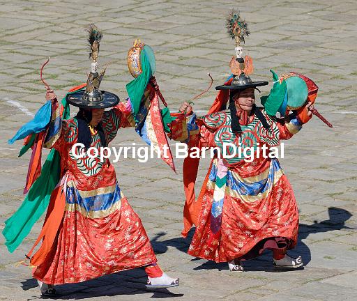 Two black hat dancers beating drums and dressed in gorgeous silk robes prance across the courtyard of Mongar Dzong. Mongar, Bhutan, Druk Yul. 18 November 2007