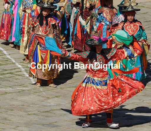 A black hat dancer beating drums and dressed in gorgeous red silk robes leads a procession of his colleagues and starts the dance with a spin in the courtyard of Mongar Dzong during the Mongar festival, Mongar Tsechu. Mongar, Bhutan, Druk Yul. 18 November 2007