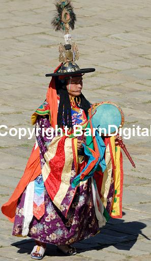 A black hat dancer dressed in gorgeous silk robes and holding a drum dances in the courtyard of Mongar Dzong. Mongar, Bhutan, Druk Yul. 18 November 2007