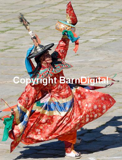 A black hat dancer dressed in gorgeous silk robes spins across the courtyard of Mongar Dzong. Mongar, Bhutan, Druk Yul. 18 November 2007