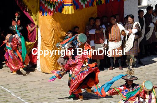 Black hat dancers in gorgeous silk robes dancers twist and spin in front of an audience in Bhutanese national dress in the courtyard of Mongar Dzong during the Mongar festival, Mongar Tsechu. Mongar, Bhutan, Druk Yul. 18 November 2007