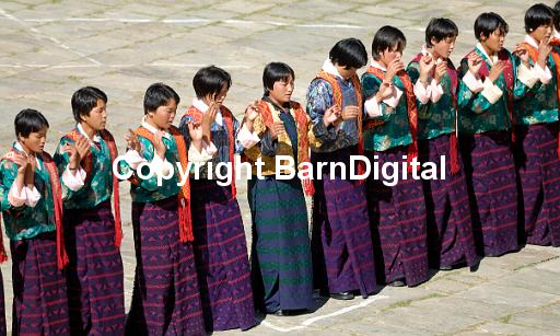 A choir of elegant young ladies at the Mongar festival, Mongar Tsechu. The ladies are dressed in traditional style in Kira (skirt) wonju (blouse) and toego (jacket). Mongar Dzong. Mongar, Bhutan, Druk Yul. 18 November 2007