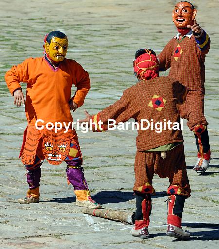 Three bawdy masked clowns, atsara, argue as part of the story that is being told by the clowns and dancers at the Mongar festival, Mongar Tsechu. Clowning is an important part of the Mongar festival. Mongar Dzong. Mongar, Bhutan, Druk Yul. 18 November 2007
