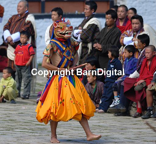 A dancer in brightly coloured dress and a painted animal mask representing a spirit enacts a moral fable in the courtyard of Mongar Dzong during the Mongar festival, Mongar Tsechu. He is watched by an audience in Bhutanese national dress. Mongar, Bhutan, Druk Yul. 18 November 2007