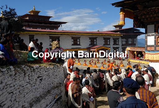 Crowds of people in festival dress and dancing monks in the courtyard of Mongar Dzong during the Mongar festival, Mongar Tsechu. Mongar, Bhutan, Druk Yul. 18 November 2007