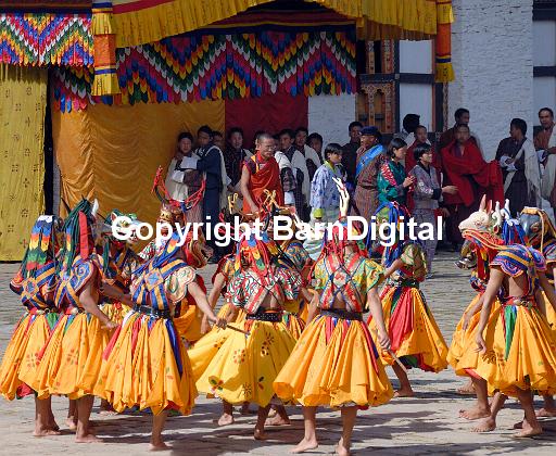 Dancers in brightly coloured dress and painted animal masks representing spirits enact a moral fable in the courtyard of Mongar Dzong during the Mongar festival, Mongar Tsechu. They are watched by an audience in Bhutanese national dress. Mongar, Bhutan, Druk Yul. 18 November 2007