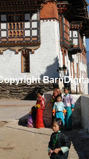 Children in national dress wait outside Trashigang Dzong during the Trashigang festival, Trashigang Tsechu. They are dressed in traditional style in Kira (skirt) wonju (blouse) and toego (jacket). The whitewashed stone walls of the Dzong are in the background. Trashigang Dzong, Trashigang, Bhutan, Druk Yul. 19 November 2007