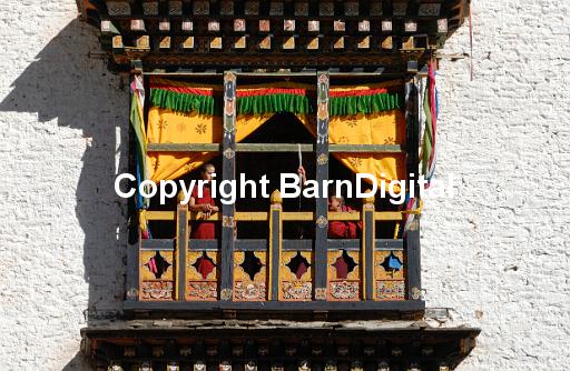 Two young buddhist monks watch dancers and musicians at the Trashigang festival, Trashigang Tsechu. They are standing on a brightly draped ornate wooden balcony or window in the white wall of the .Trashigang Dzong, Trashigang, Bhutan, Druk Yul. 19 November 2007