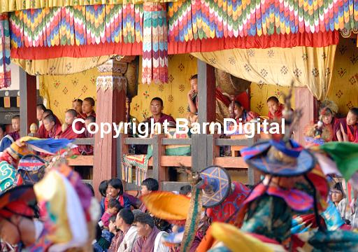 Young monks and monks playing cymbals and drums sit on a brightly decorated balcony watching black hat dancers at the Trashigang festival, tsechu. Trashigang Dzong, Trashigang, Bhutan, Druk Yul. 19 November 2007.