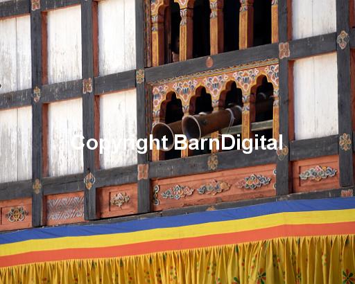 The ends of two long musical bass horns protrude from an ornate window in the wall of the Trashigang Dzong during the Trashigang festival, tsechu. These are used to produce a long bass note which, together with cymbals and bells accompany the dancers below. Trashigang Dzong, Trashigang, Bhutan, Druk Yul. 19 November 2007