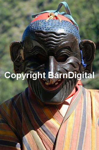 Portrait of a grinning masked clowns, atsara, at the Trashigang festival, tsechu. He is wearing a blacked carved wooden mask. Trashigang Dzong, Trashigang, Bhutan, Druk Yul. 19 November 2007