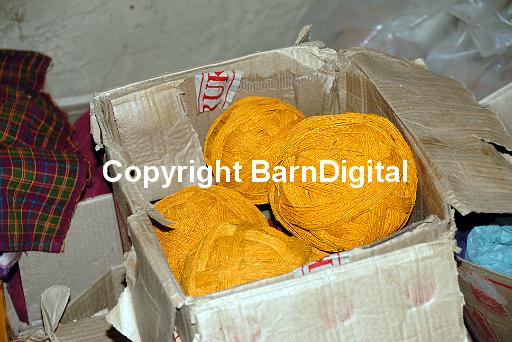 Balls of bright yellow silk thread in an old cardboard box ready for weaving Trashgang. Trashigang, Bhutan, Druk Yul. 19 November 2007