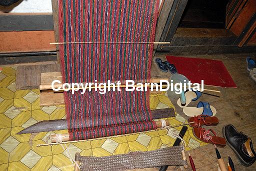 A backstrap loom set up on the verandah of a farm house for weaving a length of cloth in a traditional pattern for clothing. The threads are coloured using natural dyes. Trashigang, Bhutan, Druk Yul. 19 November 2007