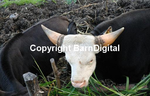 A mithun (Bos frontalis) cross cow munches on very rough grass. These cross breeds are bred in Buhtan because they can thrive on the very rough vegetation that grows in this mountainous area. Southern Bhutan, Druk Yul. 20 November 2007