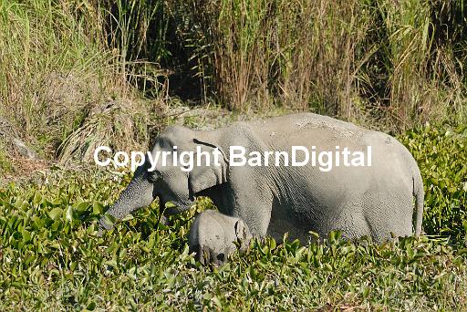 Two female wild Indian Elephant Elephas maximus indicus baby eat