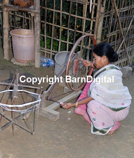 A woman working in a cooperative of silk uses a bicycle wheel based device to spool silk thread. Kaziranga National Park, Assam, India. 23 November 2007