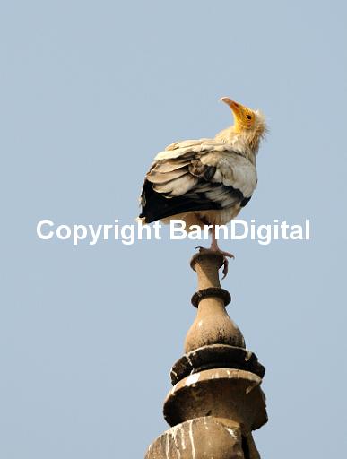 An Egyptian Vulture (Neophron percnopterus) perches on a spike on the roof of the sandstone Jahangir Mahal (Palace) Orchha, Madhya Pradesh, Republic of India 06 December 2008
