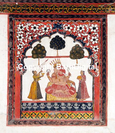 A bright and vibrant seventeenth century mural paintings in the royal apartments of Jahangir Mahal (Palace) at Orchha depicts Ganesh and attendants. The palace was built by the Bundela rajas during the seventeenth century and the murals illustrate the quality and opulence of the palace when it was new. Orchha, Madhya Pradesh, Republic of India 06 December 2008