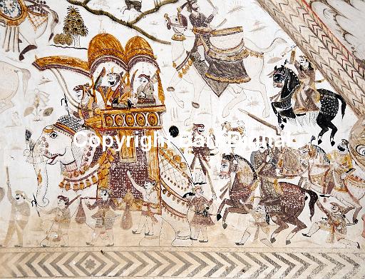 Mural of warriors on foot and horseback being led into battle by a maharaja on elephant back at the Laxmi or Lackshmi Narayan temple in Orccha. The Laxmi temple was built in 1622 and renovated in 1793. The walls are decorated with mural paintings depicting episodes form the Ramayana and Srimad Bhagavata in the style of the Bundelkhand school. Orccha, Rajasthan, Republic of India. 6 December 2008