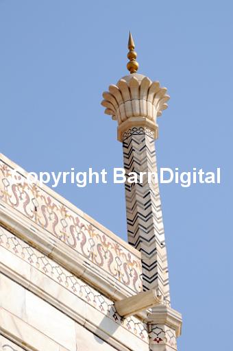 A spire, one of many surrounding the dome and tomb chamber of the Taj Mahal. This is made of white marble inlaid with coloured stone in a herringbone pattern. Agra, Uttar Pradesh, Republic of India. 07 December 2008.
