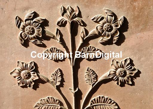 Sandstone panel delicately carved with flowers. Taj Mahal, Agra, Uttar Pradesh, Republic of India. 07 December 2008.