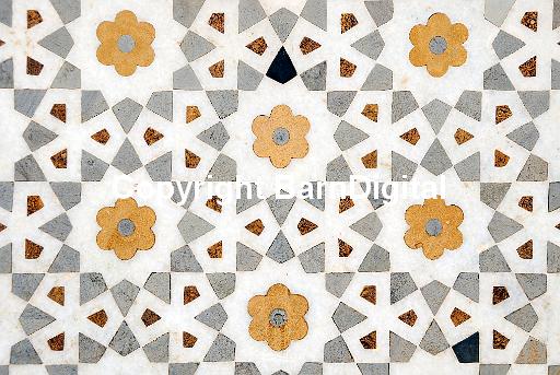 A repeating pattern of regular shapes made from semi precious stones inlaid in white marble. Taj Mahal, Agra, Uttar Pradesh, Republic of India. 07 December 2008.