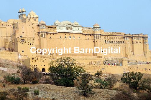 The massive sandstone walls and fortifications of the Amber Fort built in the 1590s by Raja Man Singh. Amber, Jaipur, Rajasthan, Republic of India. 11 December 2008.