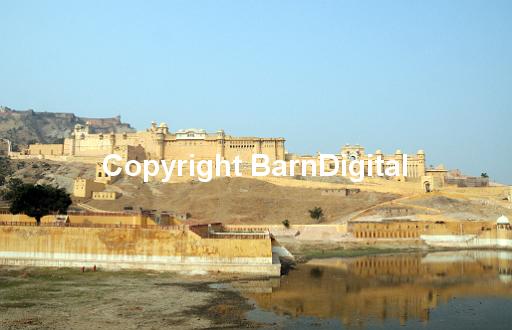 The massive sandstone walls and fortifications of the Amber Fort built in the 1590s by Raja Man Singh. On the ridge above the Amber Fort can be seen the earlier Jaigarh Fort. Amber, Jaipur, Rajasthan, Republic of India. 11 December 2008.