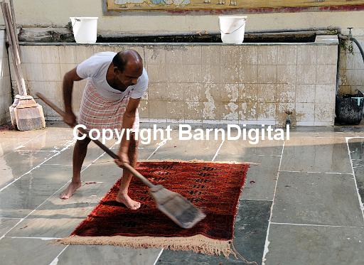 A workers in a hand made carpet cooperative in Jaipur vigorously washes a newly hand knotted carpet with water and a wooden paddle. Jaipur, Rajasthan, Republic of India. 11 December 2008